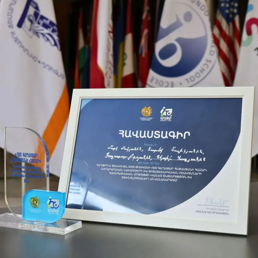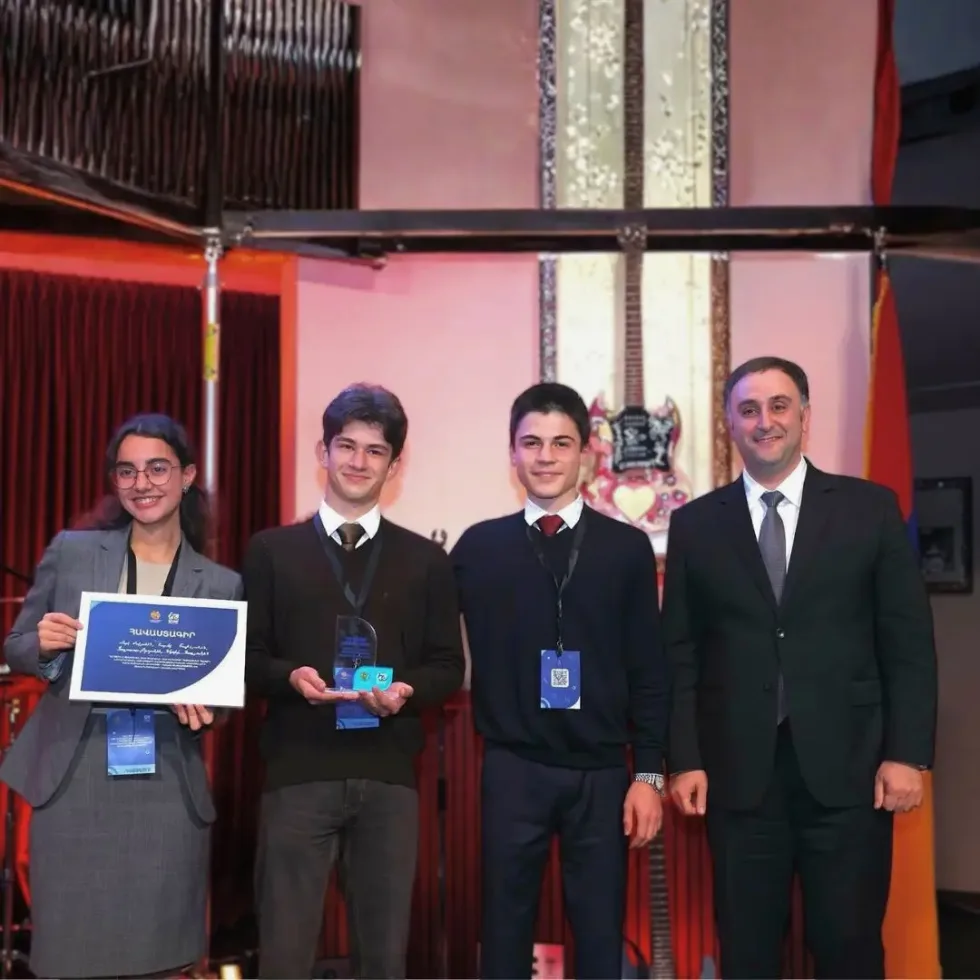 We are proud to announce that Arpi Hajyan, Mark Makyan, Khachatur Bdoyan, and Narek Tsaghikyan, students of the Shirakatsy lyceum, participated in the “100 Ideas for Armenia” competition and were awarded a prize!